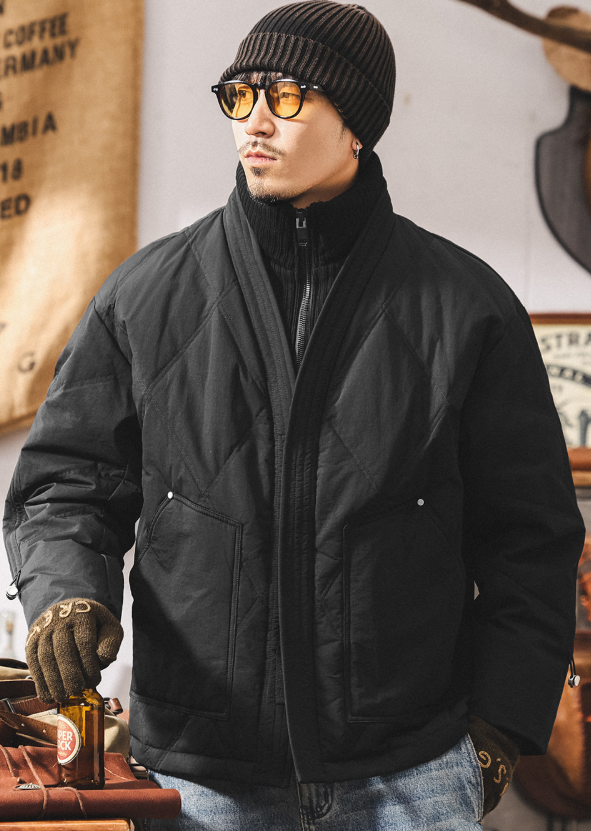 Легкая осенне-зимняя модная брендовая теплая куртка с воротником шалька и отстёгивающимся трикотажным воротником. Состав наполнителя 90% белый утиный пух.Куртка из жатой ткани с модной простёжкой. Куртка оснащена удобными карманами, практичным замком-молнией и кнопками. Оформление дополнено качественными металлическими элементами. Модели присущ универсальный крой, подходящий для повседневной носки и деловых образов. Идеально сочетается с джинсами, брюками, юбками. Подходит для города и загородных прогулок – оптимальный выбор для переменчивой погоды осени и начала зимы.рисунком простёжки. Производится в двух цветах хаки и чёрный