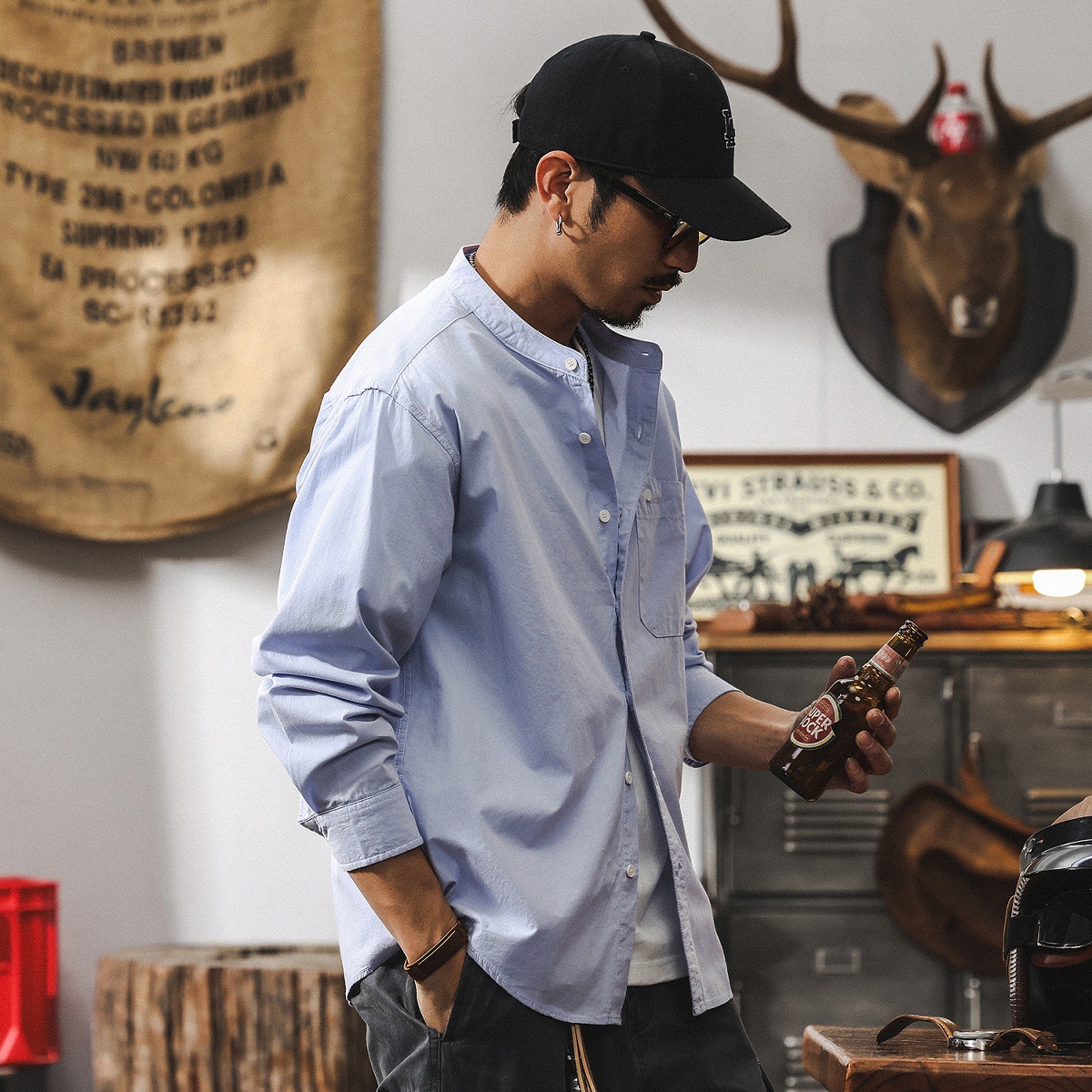 Стильная рубашка с воротником стойкой выполнена в классическом стиле. Модель оснащена длинными рукавами и дополнена функциональным накладным карманом. Состав 100 % хлопок.