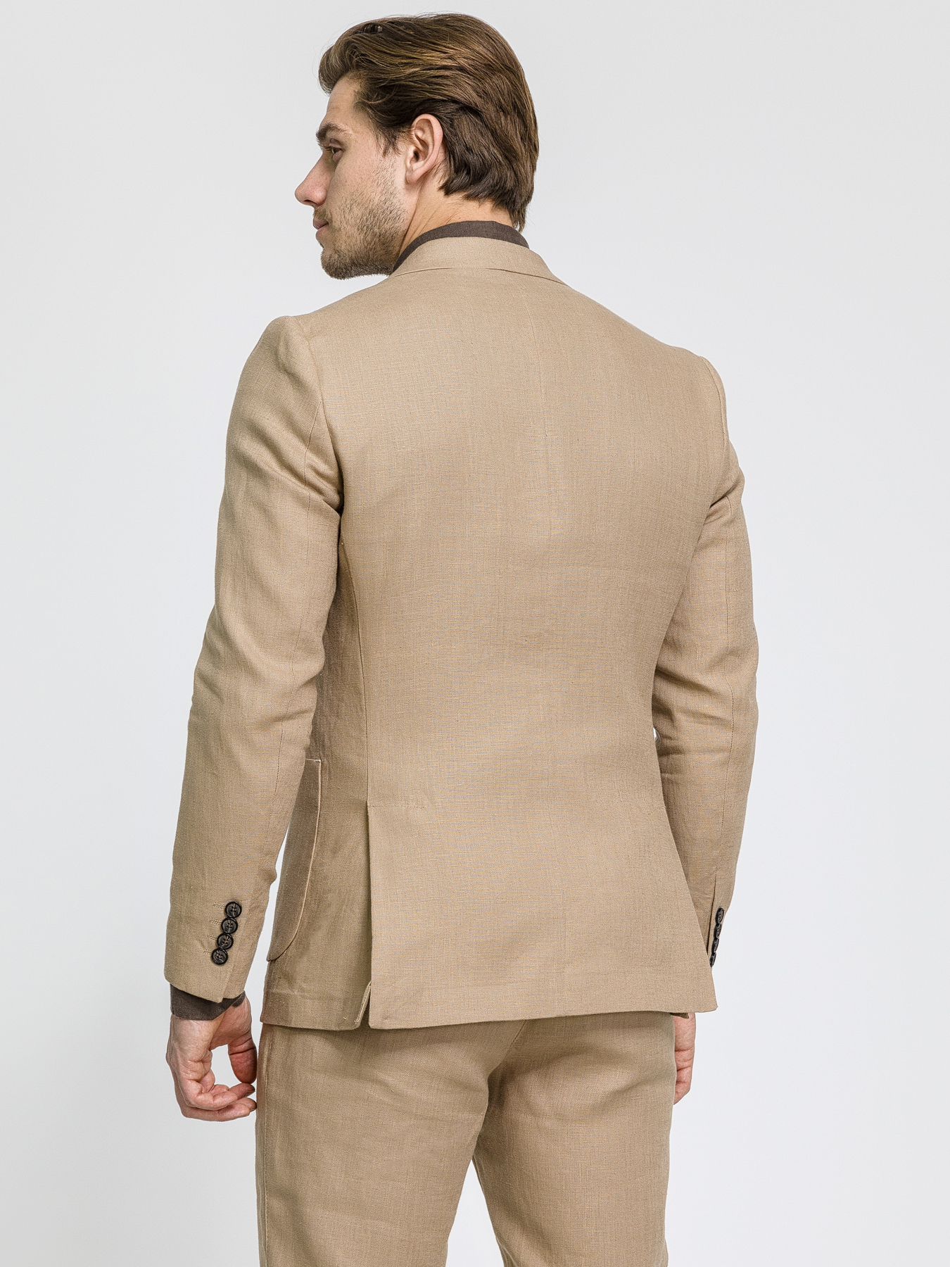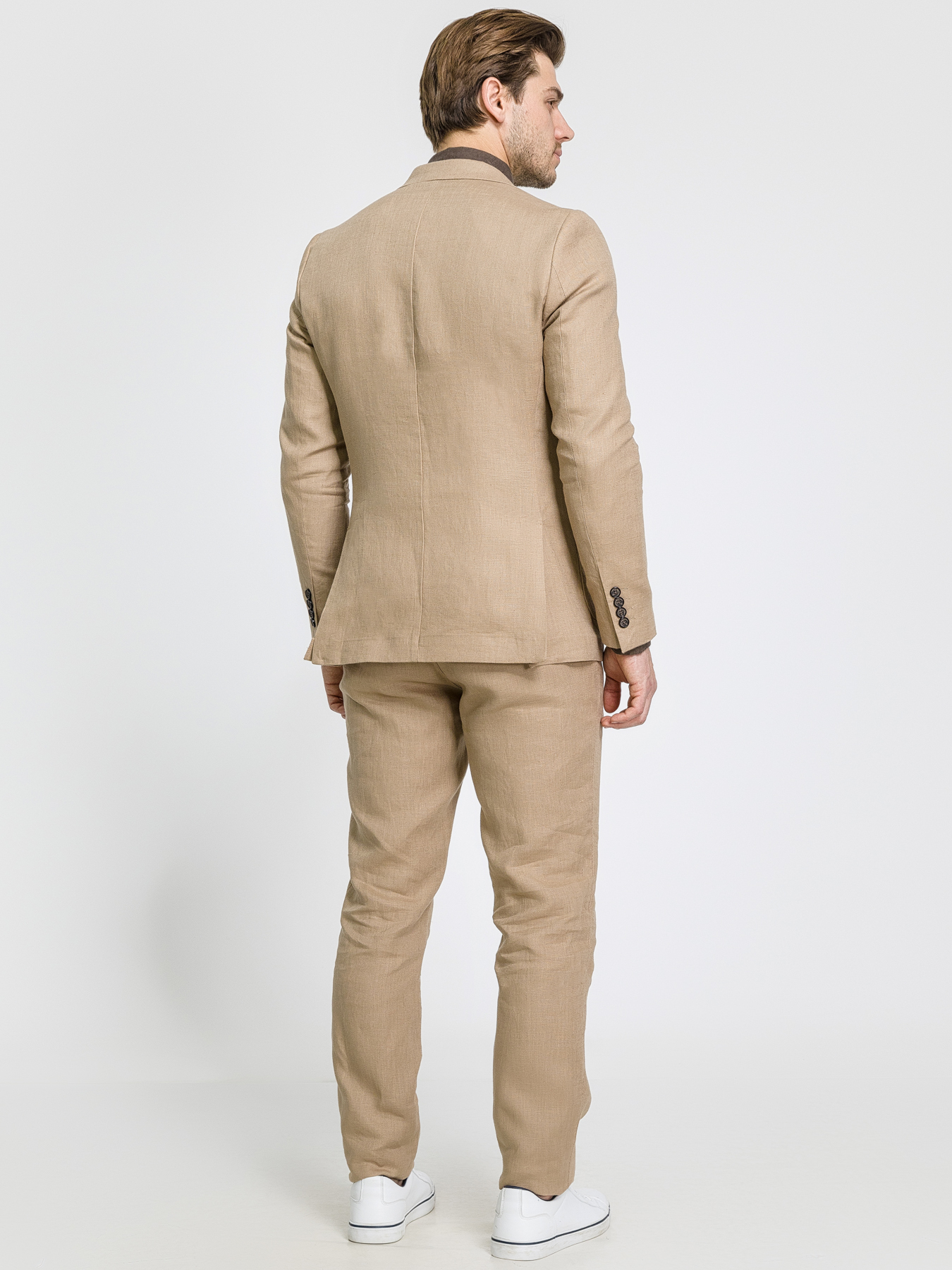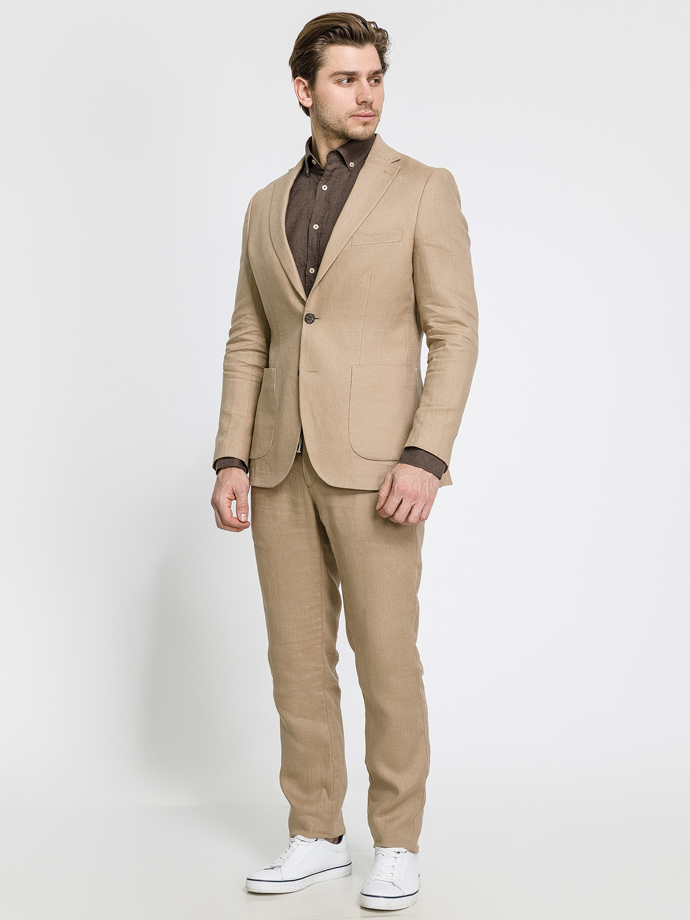 Приталенный силуэт идеально подчеркнет все достоинства фигуры, а натуральная ткань обеспечит комфорт даже в самую жаркую погоду. Этот стильный костюм станет отличным выбором для любого торжественного мероприятия.Приталенный мужской костюм из льна бежевого цвета