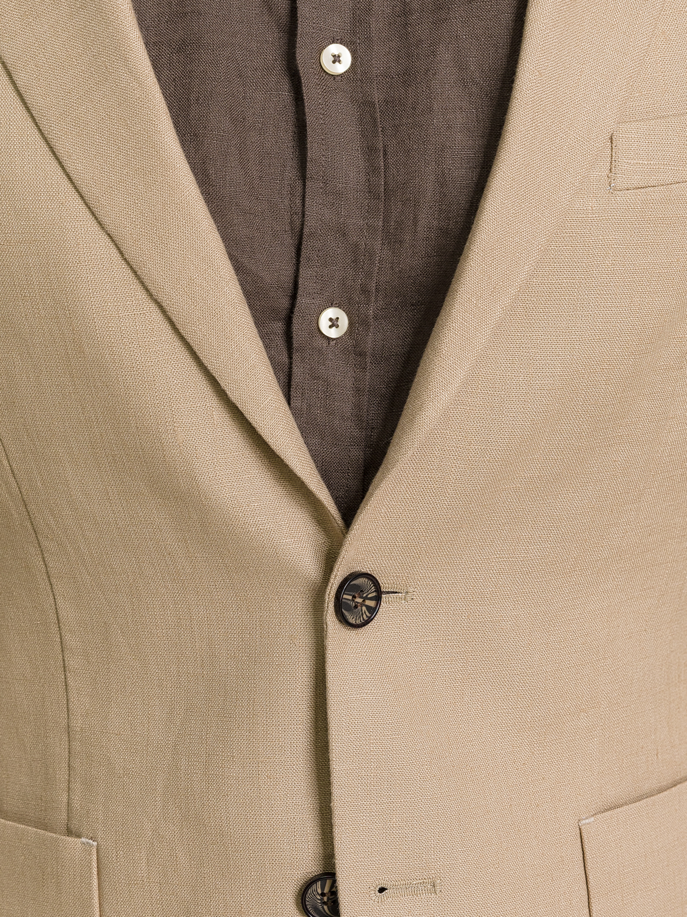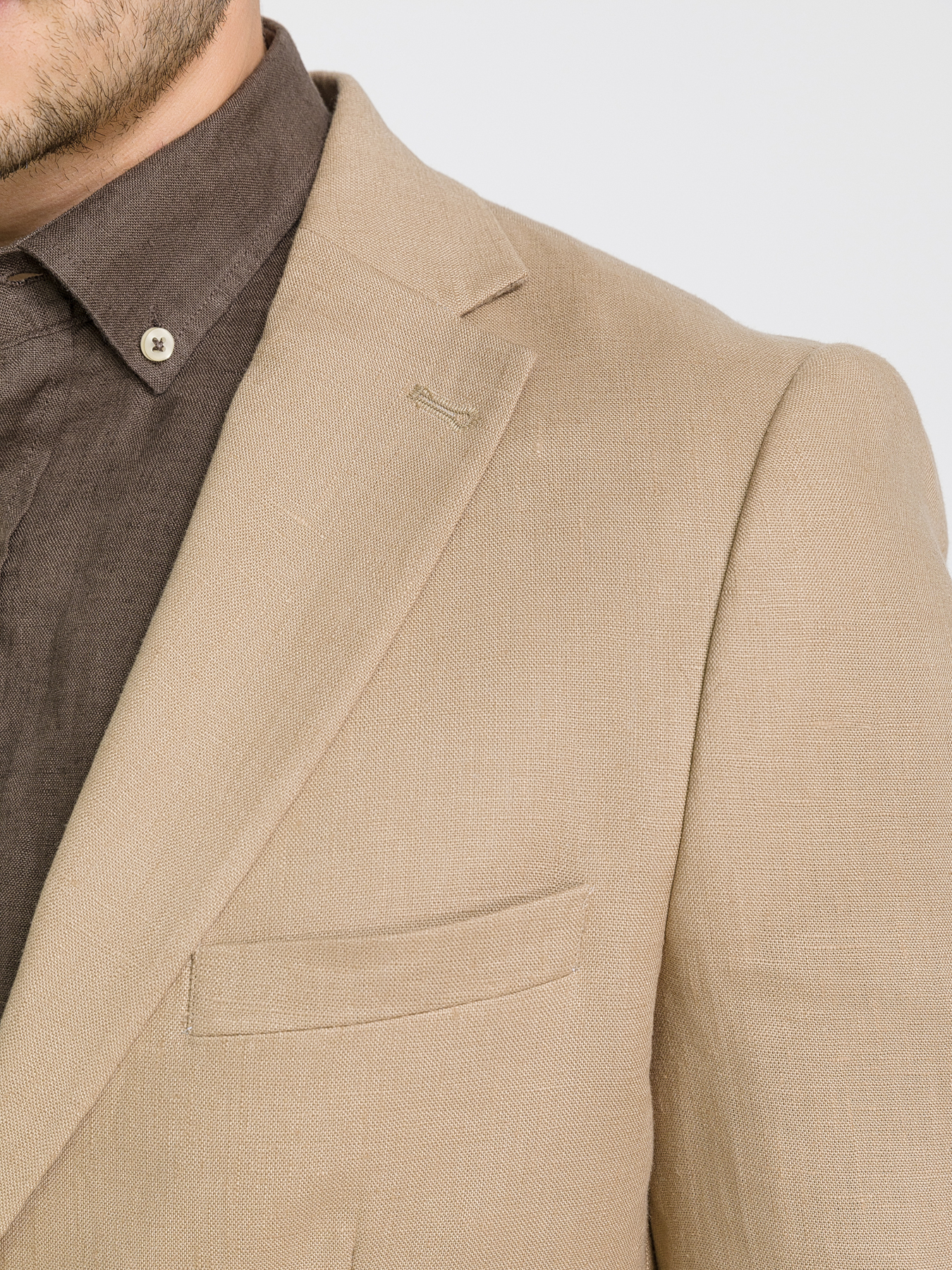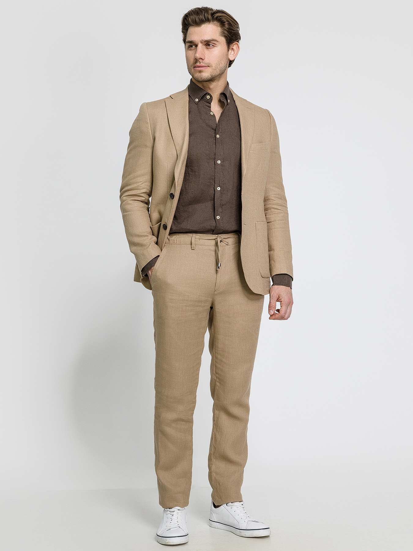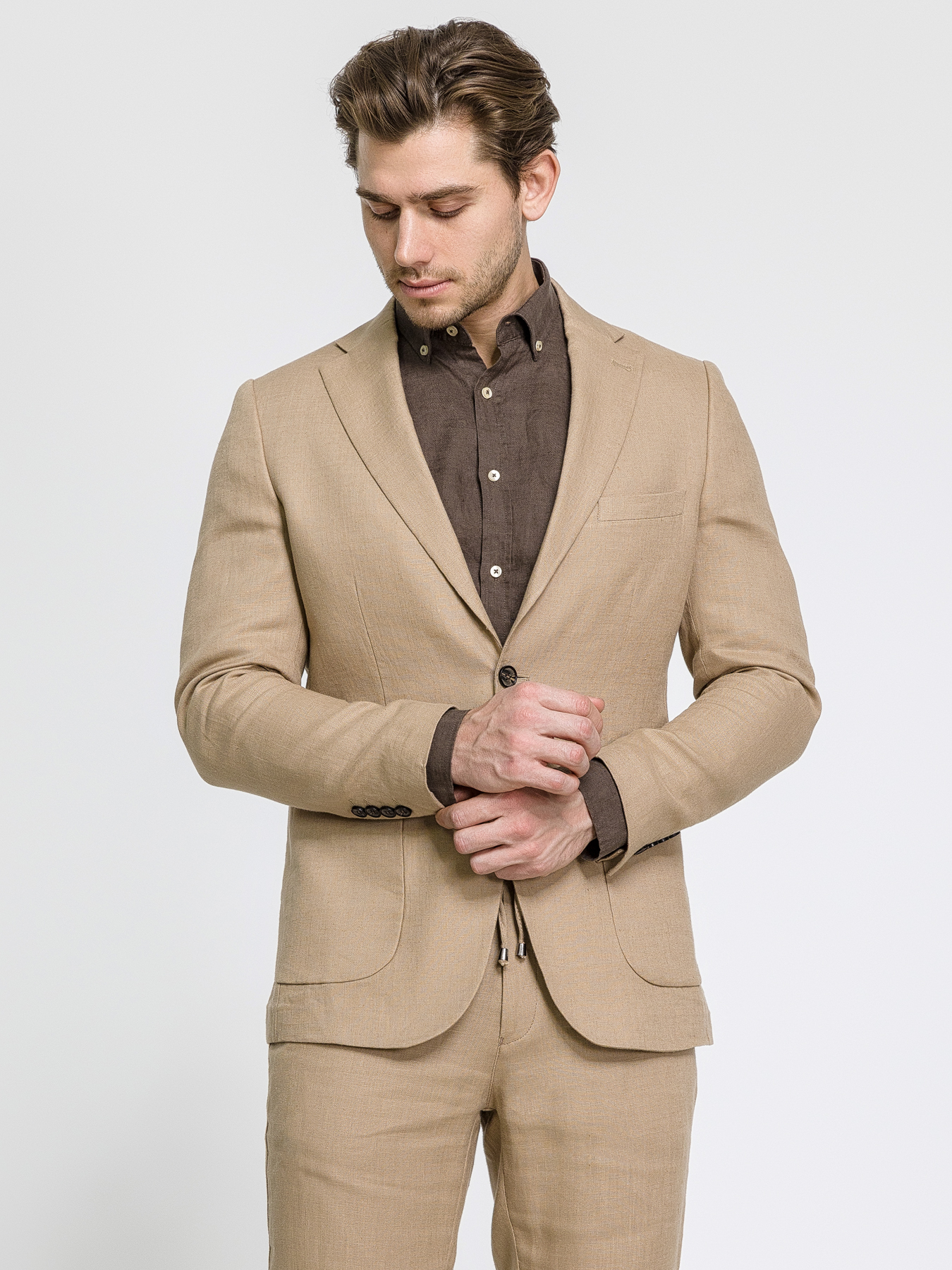 Приталенный силуэт идеально подчеркнет все достоинства фигуры, а натуральная ткань обеспечит комфорт даже в самую жаркую погоду. Этот стильный костюм станет отличным выбором для любого торжественного мероприятия.Приталенный мужской костюм из льна бежевого цвета