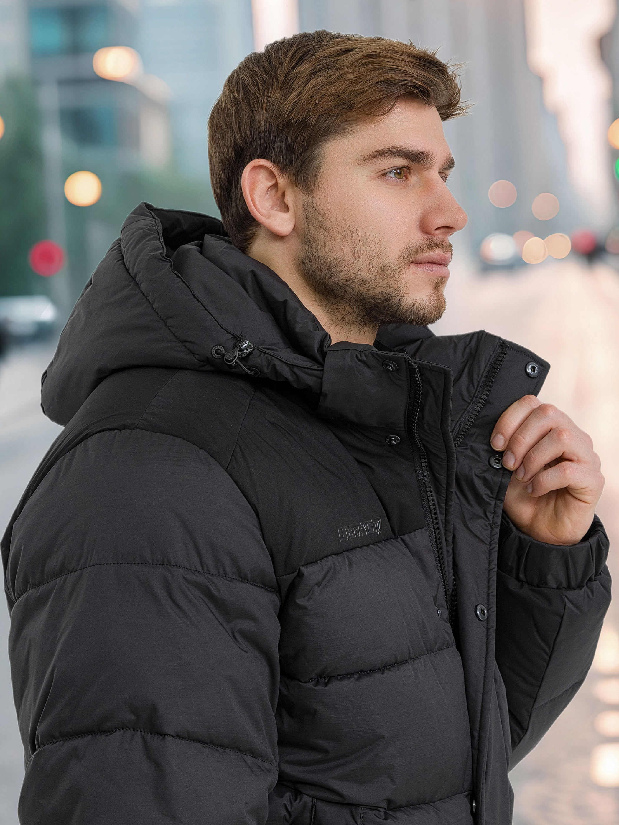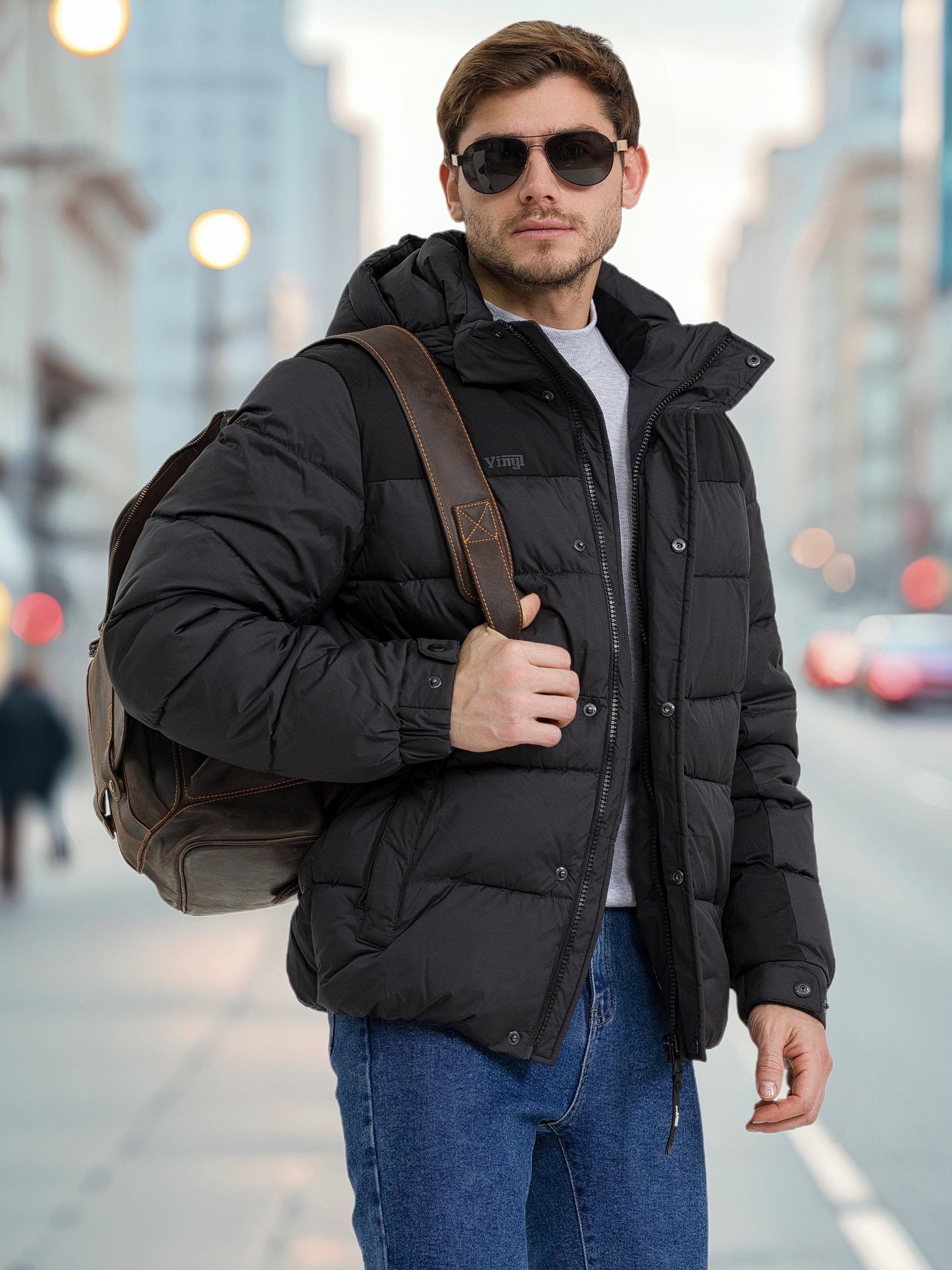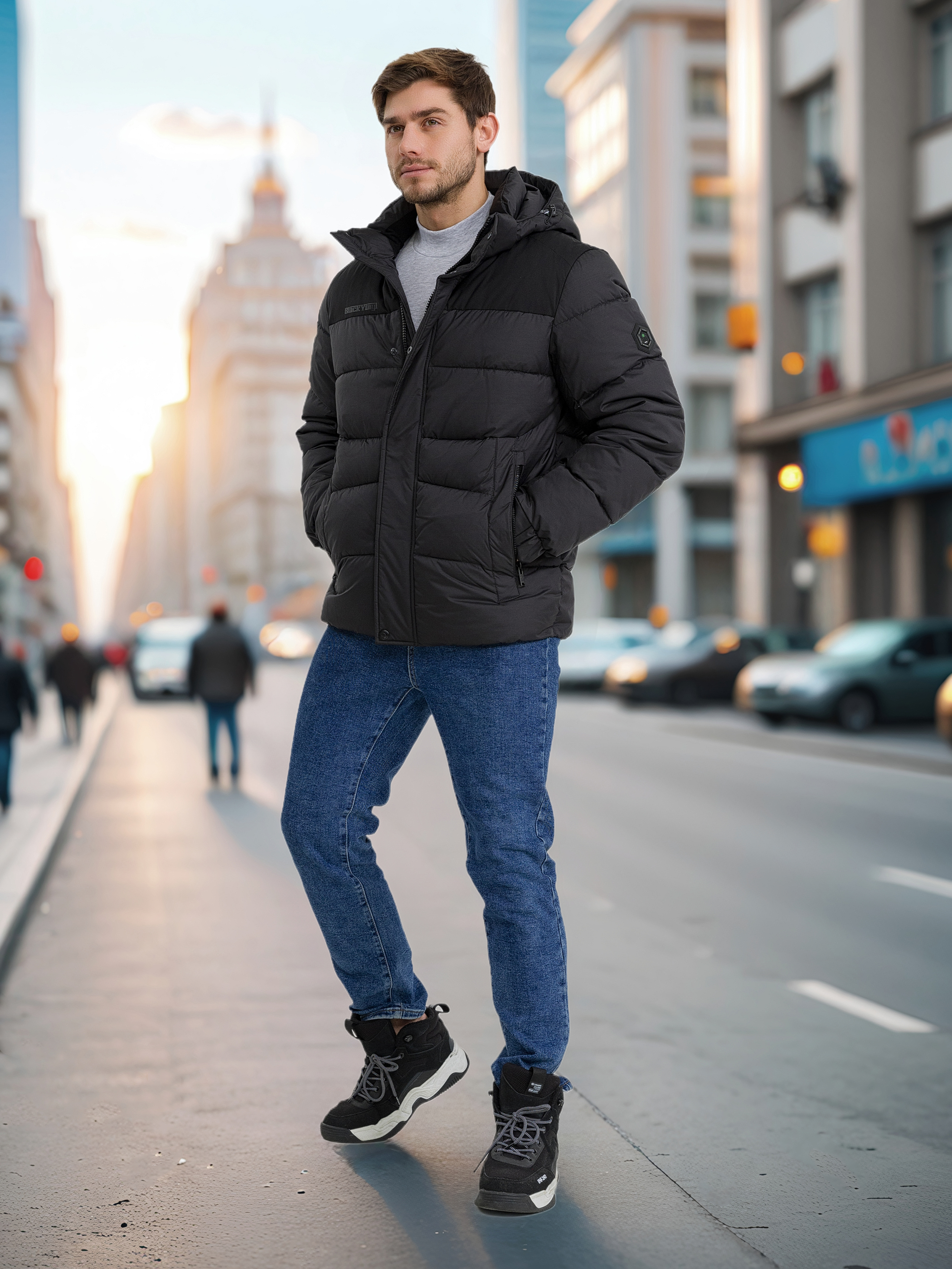 Черная мужская зимняя куртка (артикул C23-2257) — стильный выбор настоящего зимнего сезона! Изящно сочетает комбинаторную ткань и стеганную форму. Нижняя часть снабжена невидимой резинкой, подчеркивающей фигуру. Продукт премиум-бренда Black Vinyl станет вашим верным спутником холодными днями, сочетая элегантность дизайна и комфорт ношения.