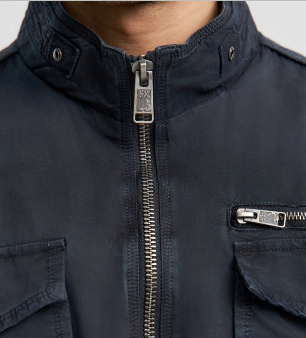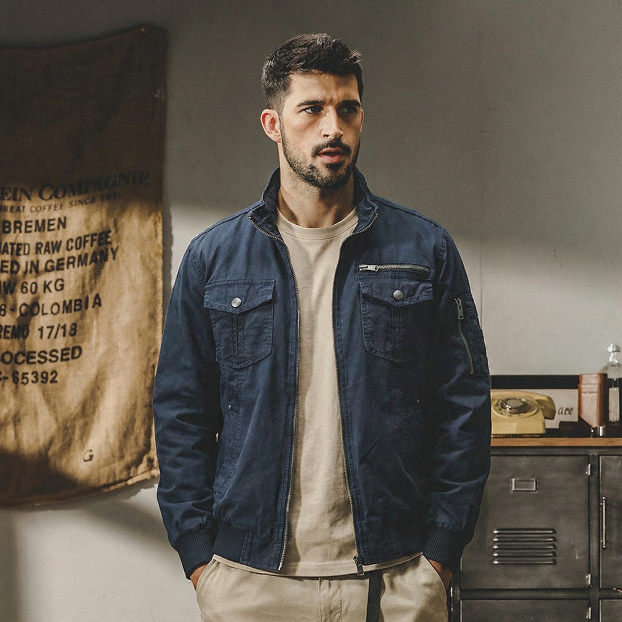Мужская ветровка в стиле американского ретро с натуральным хлопком — идеальный летний спутник! Металлическая фурнитура подчёркивает качество. Большое число карманов решает вопрос хранения нужных вещей: два нагрудных слева (один на кнопке, другой на молнии) и накладные справа. Дополнительные карманы снизу и небольшой резерв на рукаве гарантируют комфортное пространство для ваших аксессуаров.
