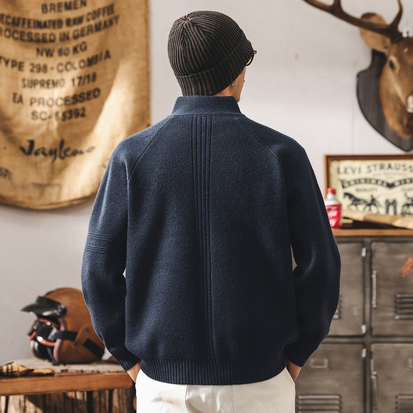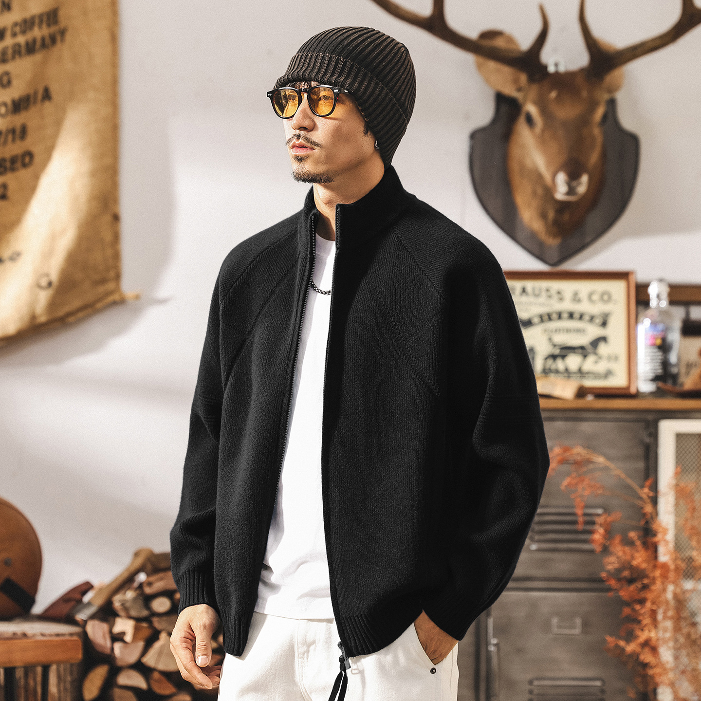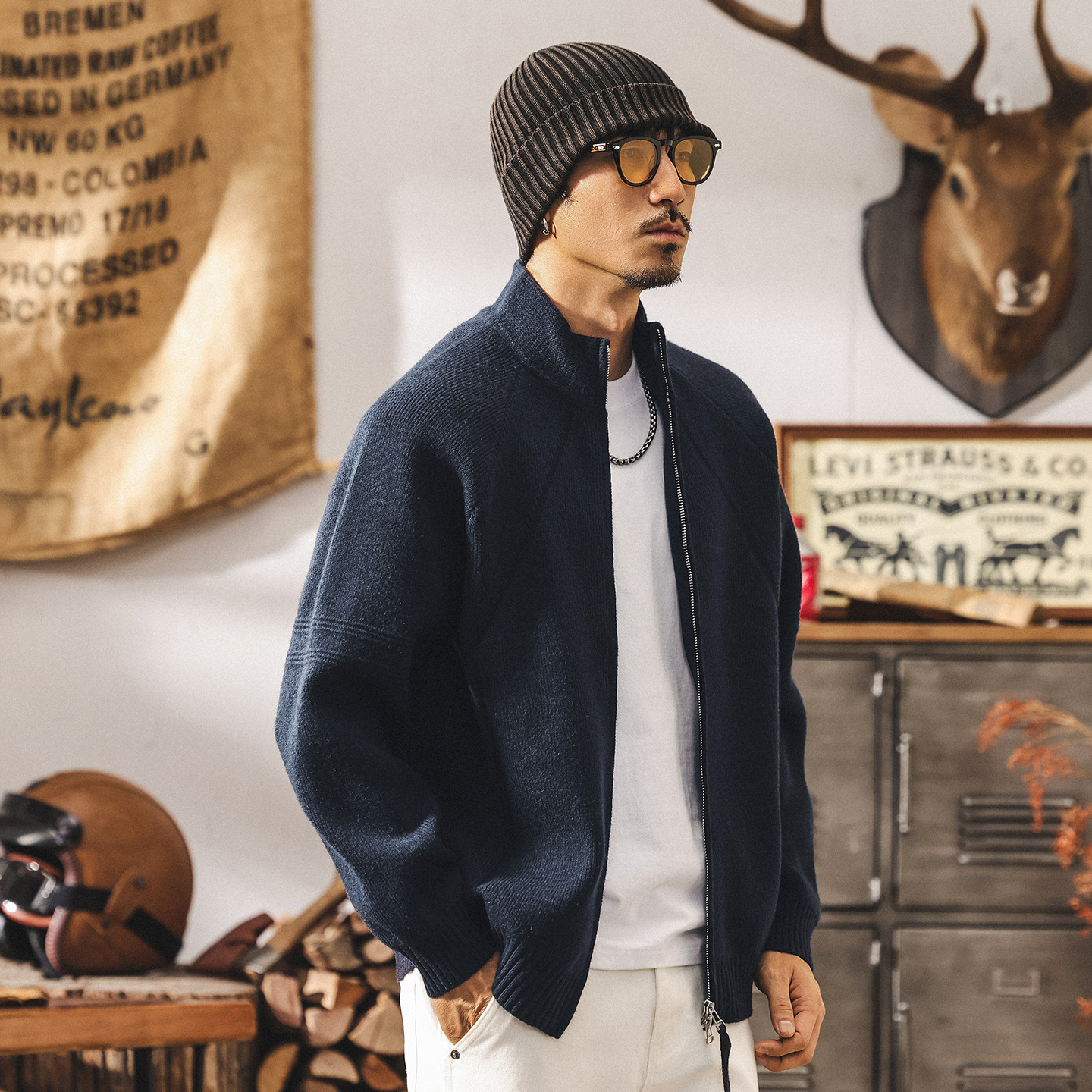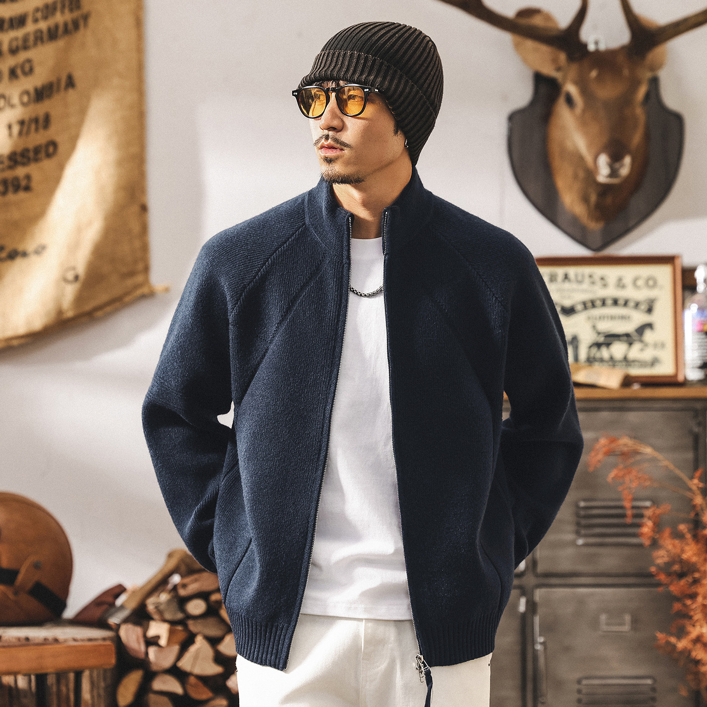 Мужской вязаный кардиган в стиле американского ретро. Подходит для весны и осени. Изготовлен из качественного трикотажа. Дизайн включает функциональную двойную молнию.