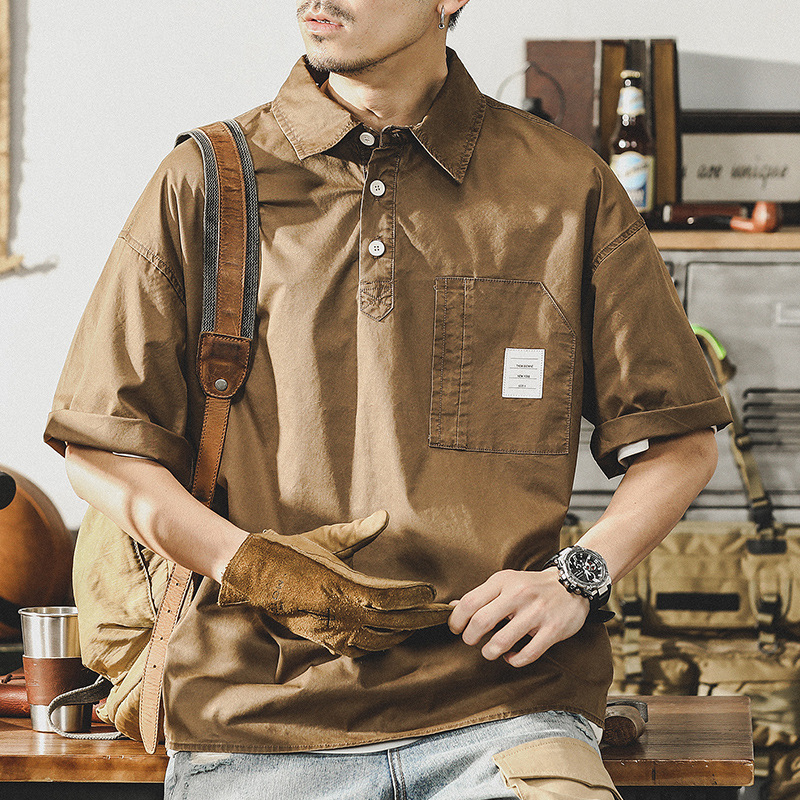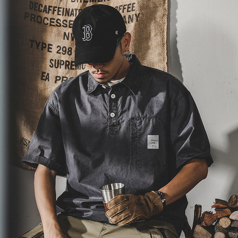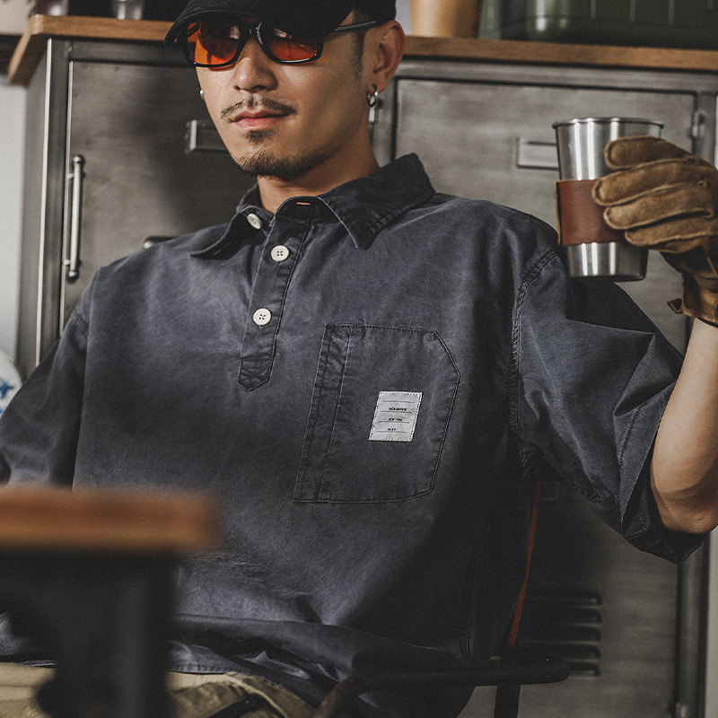 Винтажная футболка-поло свободного кроя в японском стиле. Предназначена для мужчин, выполнена с укороченными рукавами. Идеально подходит для летнего сезона благодаря своему удобству и стильному внешнему виду.